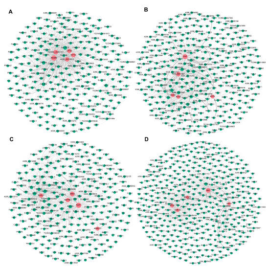 To further explore candidate DEGs that regulate pigeon skeletal muscle growth and development, we visualised the four significant modules identified by WGCNA based on the top 1000 mRNA−mRNA interaction pairs in each module. Four mRNA−mRNA regulatory networks were constructed, corresponding to black, brown, cyan, and turquoise modules, respectively. The black, brown, cyan and turquoise modules contained 265, 308, 276, and 402 mRNAs, respectively (Figure 3).