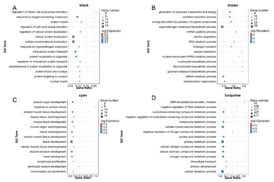Bubble plots of the GO enrichment analysis of DEGs in the four pigeon skeletal muscle−related modules. (A–D) represent GO enrichment analysis of DEGs in black, brown, cyan and turquoise modules. Colours from red to blue indicate p-value from small to large. The bubble size indicates the number of DEGs included in each biological process.