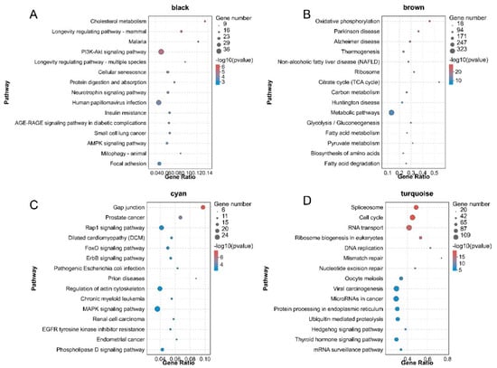 Bubble plots of the KEGG pathway enrichment of DEGs in the four pigeon skeletal muscle−related modules. (A–D) represent KEGG pathway enrichment analysis of DEGs in black, brown, cyan and turquoise modules. Colours from red to blue indicate p-value from small to large. The bubble size indicates the number of DEGs included in each biological process.