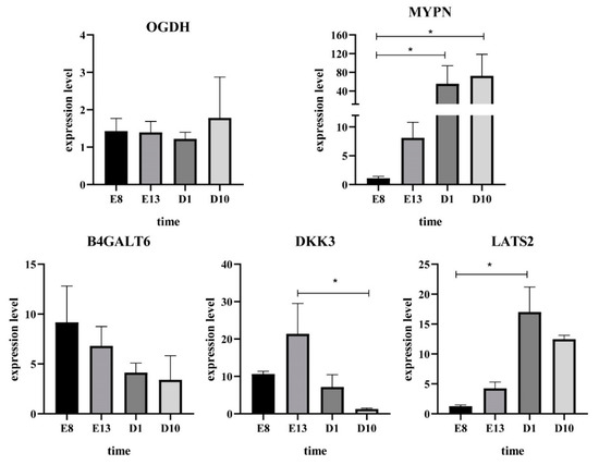 In order to confirm the differentially expressed genes among the modules obtained by RNA−Seq, five differentially expressed genes (LAST2, MYPN, DKK3, B4GALT6 and OGDH) in the network were selected, and their expression patterns were quantified by qRT−PCR. The results are consistent with our sequencing results, highlighting the reliability of our sequencing data (Figure 6).