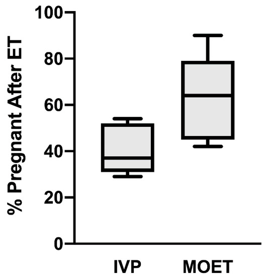 Differences in pregnancy retention after embryo transfer (ET) of in vitro-produced (IVP) embryos or embryo transfer of in vivo-produced embryos (termed MOET). Both IVP and MOET were evaluated within the same study in seven independent studies. Day of pregnancy detection ranged from day 30 to term. Six studies used Bos taurus cattle, and one study used Bos indicus cattle. In vivo-produced embryos were generated by superovulation, AI and uterine flushing at d 7 post-breeding. Each box contains the minimum and maximum values for each group, and the mean is represented by the line within the box. The bars represent SEMs. Adapted from [5].