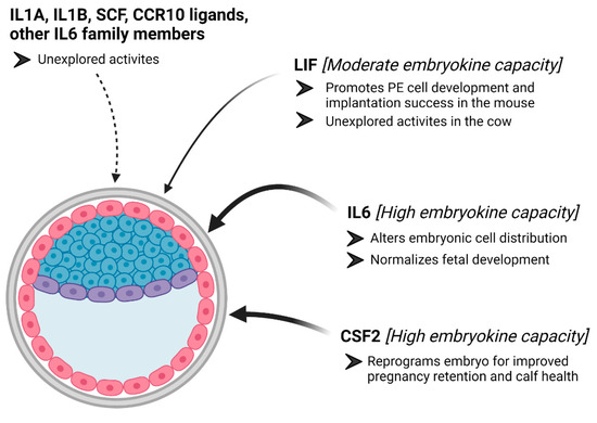 The following sections will explore the embryokine-related actions for CSF2, IL6, and LIF, as well as additional cytokines that may have the capacity to serve as embryokines.