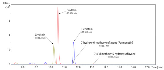 UHPLC/MS analysis was used to determine the content of isoflavones and soyasaponins in the MED with regard to their possible antibacterial properties. As described in Table 2, the only isoflavones detected in countable values were the aglycone forms, namely daidzein, genistein, and glycitein, with respective amounts of 236.30, 131.23, and 29.00 ng/mg. Figure 1 shows their occurrence in the MED within a chromatogram. Other isoflavones that can contribute to the MED’s properties but that were present only as traces were demethyltexasin, dimethylgenistein, methoxyisoflavone, formonetin, 7-hydroxy-6-methoxyisoflavone, and 7,3′4′-trihydroxyisoflavone.