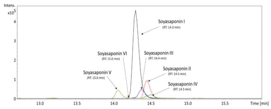 As described in Table 2, the most abundant soyasaponin found in the MED was soyasaponin I, with an average content of 515.40 ng/mL. In addition to soyasaponin I, five other minor soyasaponins were determined in the sample. They were tentatively identified as soyasaponin II, III, IV, V, and VI (see Figure S1 and Table S2). Other detected soyasaponins’ content was only estimated relatively as the percentage of the peak area of soyasaponin I due to the lack of reliable standards in the study. In terms of abundance in the sample, soyasaponin I was followed by soyasaponin II (0.189%), soyasaponin III (0.136%), soyasaponin V (0.111%), and soyasaponin IV (0.062%). The presence of soyasaponin VI was detected only in trace amounts, as can be seen in Figure 2.