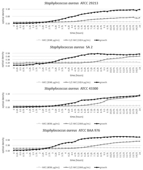 To evaluate the influence of the MED concentration (MIC and ½ MIC) on the growth of different S. aureus strains, representative of the MSSA (ATCC 29213) and MRSA groups (ATCC 43300), a clinical specimen from the culture collection (ATCC BAA 976), and a clinical isolate obtained from Motol University Hospital in Prague, Czech Republic (SA 2), were chosen to undergo standardized microdilution assay along with growth curve modeling [56]. Briefly, determination was performed in 96-well microtiter plates, involving eight two-fold serial dilutions of the tested compound starting at a concentration of 4096 µg/mL (from which only the MIC and ½ MIC were chosen to be displayed in the growth curve figures) in Mueller–Hinton broth. Next, the plates were inoculated with bacterial suspensions at a final density of 5 × 105 CFU/mL and, standardized using Densi-La-Meter II by adjusting the turbidity of the microorganism suspension to the 0.5 McFarland standard, as with the MIC determination. Subsequently, incubation at 37 °C was performed, and the absorbance of each well was measured spectrophotometrically by an Infinite® 200 PRO Microplate Reader (Tecan, Männedorf, Switzerland) at 405 nm every fifteen minutes for 5.25 h, then every thirty minutes for 9 h, and additionally after 24 h.