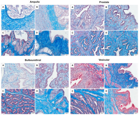 Representative images of the accessory sex glands stained with Masson’s Trichrome stain. Glands pictured come from a male fetus (A) 280–310 days gestation, prepubertal colt (B) 4–10 months, mature stallion (C) >5 years, and gelding (D) >5 years.