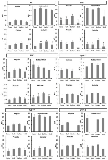 Mean mRNA expression in male equine accessory sex glands during different life stages (n = 3 per life stage). Data are expressed as mean ΔCT relative to expression of GAPDH. Within glands, life stages with different superscripts differ in expression (p < 0.05). Abbreviations: AR, androgen receptor; ESR1, estrogen receptor 1; ESR2, estrogen receptor 2; 3βHSD, 3β-Hydroxysteroid dehydrogenase/Δ5-4 isomerase; CYP17, cytochrome P450 17α-hydroxylase/17,20 lyase; CYP19, P450-aromatase.