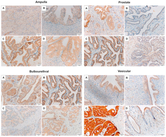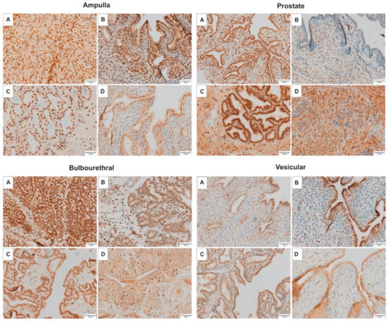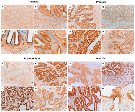 While development and regulation of the accessory sex glands is well described in some species (e.g., dogs) frequently affected by disease of the accessory sex glands, little is known about the development and function of these glands in the horse, despite the important role these glands play in determining fertility in other species. Sex steroid production and modulation are known to play an important role in reproductive development and regulation of the male reproductive tract in mammals [3,4]. Androgens are important for testicular development and maintenance of spermatogenesis in the horse, and presumably also play a role in accessory sex gland development and function [3]. In humans, androgens are vital to prostatic growth and tissue homeostasis [4]. The androgen receptor (AR) is highly expressed in the epithelium of the normal mature canine prostate, and expression decreases in diseased glands [5]. Given that horses are not prone to prostatic disease [6], it is possible that androgens do not play a significant role in glandular proliferation in the horse.