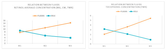 Inverse relationship between fluids (plasma and milk): Retinol average concentration (μg/mL) of the three management systems (MG, CM, TMR) and α-tocopherol concentration (μg/mL) in the TMR group at three sampling times. Management systems: MG (mountain grazing + feed supplement), CM (meadow pasture + feed supplement) and TMR (total mixed ration). Sampling times: M1 (the day of parturition), M2 (at 10 days of lactation) and M3 (at 30 days of lactation).