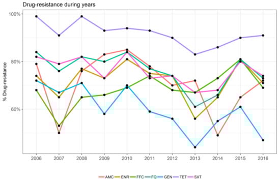 The trends of the percentage of resistance observed at the single-molecule level are reported in Figure 1. Statistically significant differences between years were recorded for FQ (F 15.43, p < 0.01), GEN (F 5.89, p < 0.05), SXT (F 13.5, p < 0.01), and TET (F 18.25, p < 0.001).