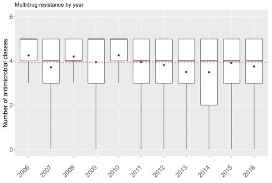 Trend of multidrug resistance during the study period. Red dashed line: the mean value of antimicrobial classes calculated for the whole period; red dots: mean value calculated for each year.
