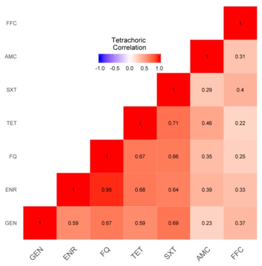 Regarding the associations between resistances to antimicrobials, positive correlations were recorded between FQ and ENR (0.95), SXT and TET (0.72), SXT and GEN (0.69), TET and ENR (0.68), GEN and TET (0.67), FQ and TET (0.67), and GEN and FQ (0.67) (Figure 3). No negative patterns were observed (Figure 3).