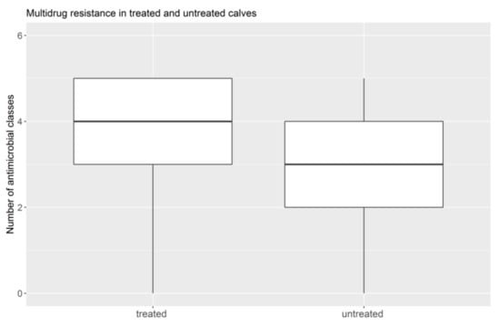 Six strains were resistant to all seven antimicrobials, and they were all isolated from treated calves. In 30 E. coli strains (18 isolated from treated calves and 12 from untreated calves), no resistance to any antimicrobial was recorded. Concerning MDR, the isolates from untreated calves showed a lower incidence, with a median value of 3 antimicrobials and a mean of 2.7 (Figure 4). The median and mean value of multidrug resistance of E. coli from treated calves was 4 antimicrobials in both cases (Figure 4). The differences were significant for both the means of the multidrug resistance (t 9.5, p < 0.0001) and for the median values (W 66.05, p < 0.0001).