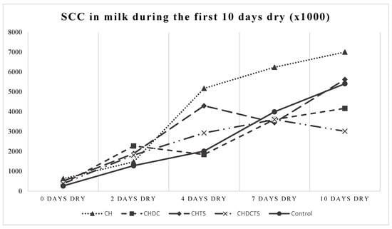 SCC (thousands/mL) by days dry and dry treatment group; no significant differences between treatments found. CH= casein hydrolysate; CHDC = casein hydrolysate + dry cow treatment; CHTS = casein hydrolysate + teat sealant; CHDCTS = casein hydrolysate + dry cow treatment + teat sealant; Control = dry cow treatment + teat sealant.