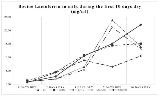 Increases in the concentration of bovine lactoferrin and bovine serum albumin in milk have been used as indicators of bovine mammary involution previously [29,33,34,36]. Besides being an indicator of mammary involution, bovine lactoferrin plays an immunologically important role during mammary involution, by binding available iron and making it unavailable for iron-dependent bacteria to grow [37,38]. It has been reported that lactoferrin presents a robust defense against IMI [36,37,38]. One week after drying off, the concentration of lactoferrin was higher in cows that were treated with casein hydrolysate compared with the controls and all but one other treatment. Therefore, it is possible these animals experienced udder health benefits, both because of faster involution as indicated by a higher concentration of lactoferrin and possibly because of its immunologic effects as well [37]. This is an interesting and valuable outcome when considering the use of alternatives to antimicrobial dry treatment.