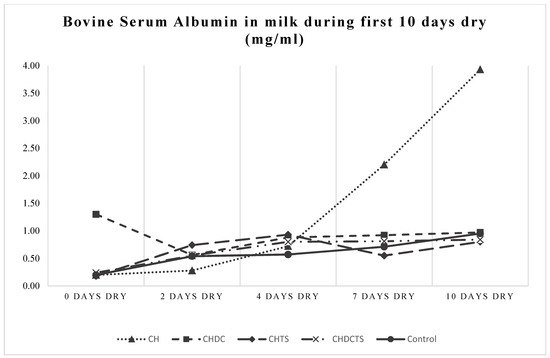 BSA by days dry and treatment group; CH cows differed from CHDC, CHDCTS and control at 10 days dry (p < 0.05, GLIMMIX). CH = casein hydrolysate; CHDC = casein hydrolysate + dry cow treatment; CHTS = casein hydrolysate + teat sealant; CHDCTS = casein hydrolysate + dry cow treatment + teat sealant; Control = dry cow treatment + teat sealant.