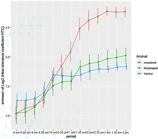 Estimated marginal means (emmean) of the heat tolerance coefficient (HTC) in crossbred, Kasaragod, and Vechur cattle, from 08:00 to 14:00.
