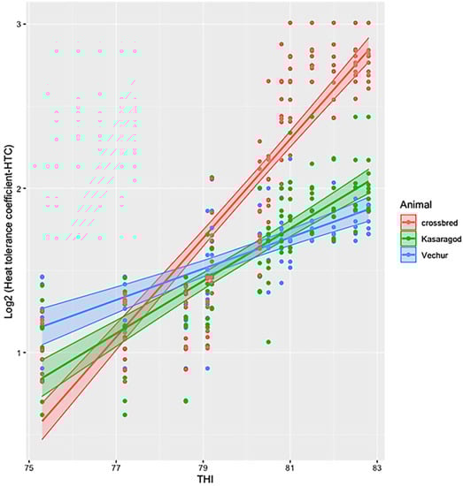 The statistical analysis was done in R (Version 4.1.0) [53]. Values for HTC and relative expression were log-transformed before analysis of variance. The effects of breed, period, and period–breed interaction was estimated. Estimated marginal means are presented. The effect of THI on HTC was also compared among animal groups. Pair-wise comparison was done using the TukeyHSD test in R. The level of significance was set at p < 0.05.