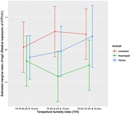 The ambient temperature and humidity increased progressively from 08:00 to 14:00. The maximum air temperature during the study period was 31.1 ° C, the relative humidity was 83.8%, the wind speed was 5.8 m/s, and the solar radiation was 1.3 MJ. The calculated THI increased from 75 at 08:00 to 83 at 14:00. There was significant variation in HTC between the groups (p < 0.01). The effects of period and period–breed interaction was also significant (p < 0.01) (Figure 1 and Figure 2). Compared to dwarf cattle, the HTC increased in crossbred animals when the THI increased (Figure 1 and Figure 2). The estimated marginal means (emm) of ATP1A1 relative expression are given in Table 2. The expression profile of ATP1A1 varied significantly between the breeds (p = 0.02). However, the period and the period–breed interactions were not significant for ATP1A1 expression (Figure 3). Pair-wise comparison of ATP1A1 expression levels in different lineages showed significant difference in expression between Kasargode and crossbred cattle (p = 0.009).
