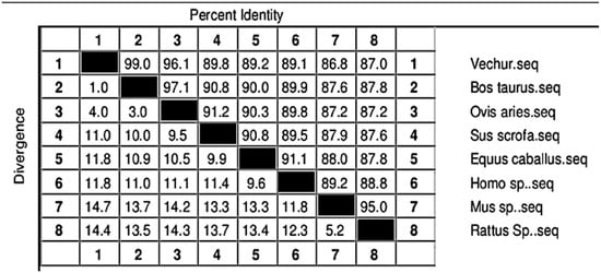 Percent identity (upper half) and divergence (lower half) of the ATP1A1 gene of Vechur cattle with similar sequences in the database.