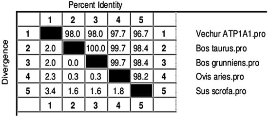 Percent identity (upper half) and divergence (lower half) of the predicted ATP1A1 protein sequence of Vechur cattle with similar sequences in the database.