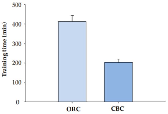 There was considerable variation in the amount of time it took the 29 animals who were successfully trained (nCBC = 14, nORC = 15). Some individuals learned the task relatively quickly, while others took significantly longer. There was no difference in the number of training sessions (Mann–Whitney U = 93, p = 0.61) between the two methods (25.9 +/− 1.3 sessions vs. 29.1 +/− 2.4 sessions for CBC vs. ORC monkeys, respectively). However, it took significantly less time (in minutes) to train animals for the CBC than ORC (t = 5.703, df = 27, p < 0.001; Figure 2). Trainers spent about twice as many minutes training monkeys for the ORC (412.4 +/− 31.7 min) than CBC (201.0 +/− 17.8 min).
