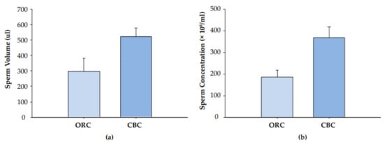 Overall, semen samples collected from males in the CBC system had a greater volume of 522.1 +/− 56.4 µL compared to those from ORC restrained animals (297.6 +/− 83.8 µL; t = 2.32, df = 15, p = 0.04; Figure 3a), with samples ranging from 340–940 µL (CBC) and 40–360 µL (ORC). A significant difference was also observed in the sperm concentrations; 367.5 +/− 51.1 × 106/mL and 186.0 +/− 32.3 × 106/mL for CBC and ORC, respectively (t = 2.70, df = 15, p = 0.017; Figure 3b). No changes were observed between the restraint systems in sperm motility with typical values expected from reproductive age males collected by both methods; 74.7 +/− 8.3 vs. 88.6 +/− 1.9% for ORC and CBC, respectively (Mann–Whitney U = 49.5, p = 0.154).