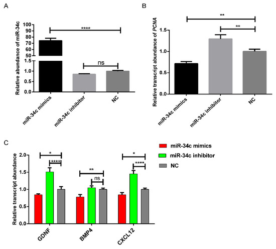 Experimental results showed that when miR-34c mimics were transfected, the relative abundance of the transcript of miR-34c was significantly increased (p < 0.0001). In contrast, the relative abundance of miR-34c was decreased when miR-34c inhibitors were transfected (Figure 1A). The qRT-PCR results for PCNA showed that miR-34c overexpression significantly decreased the relative abundance of PCNA mRNA (p < 0.01). In contrast, the relative transcript abundance of PCNA was significantly increased when miR-34c was inhibited (p < 0.01) (Figure 1B). The overexpression of miR-34c significantly decreased the relative transcript abundance of the Sertoli cell-secreted factors, including GDNF, BMP4, and CXCL12 (p < 0.01) (Figure 1C). The inhibition of miR-34c significantly increased their relative transcript abundance of GDNF and CXCL12 (p < 0.0001), and the relative abundance of BMP4 mRNA not significantly changed (Figure 1C).
