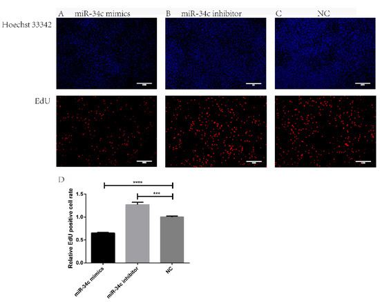 For the EdU assay, Sertoli cells were cultured in 24-well plates, transfected with miR-34c mimics, inhibitor, or NC when the cell density reached approximately 70%. Fluorescence was observed after 24 h, and EdU was detected at 48 h. According to the manufacturer’s instructions of BeyoClick EdU-555 Cell Proliferation Assay Kit (Beyotime Biotechnology, Shanghai, China), a 20 μM EdU working solution was prepared. An equal volume was added to a 24-well plate, whereby the concentration of EdU in the 24-well plate was 10 μM incubation was continued for 2.5 h. The culture solution was removed, and the cells were fixed with 0.5 mL of 4% paraformaldehyde and then permeabilized with a permeabilizing solution. After using the Click reaction solution, the cells were incubated in the dark for 30 min. Nuclear staining was performed using Hoechst 33342 to facilitate observation of the proportion of cell proliferation detected. Observed under a microscope (Olympus, Tokyo, Japan) with a magnification of 100 times, it can be found that the cell nucleus is stained blue, while the proliferating cells are red.
