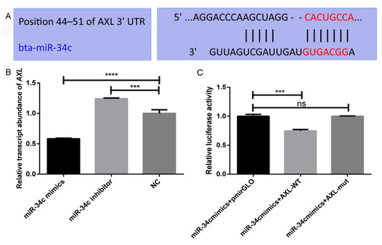 Verification of the target relationship between miR-34c and the AXL gene. (A) Sequence information of the binding site in the 3′UTR of AXL by TargetScanHuman 7.2. (B) The relative abundance of the transcript of the AXL gene. (C) Firefly and Renilla luciferase activities were measured after 48 h of transfection in Sertoli cells. *** p < 0.001; **** p < 0.0001.