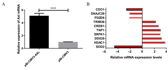 We constructed an AXL overexpression vector, and the relative abundance of the transcript of AXL increased significantly (p < 0.0001) post-transfection with pBI-CMV3-AXL (Figure 5A). The detecting genes of the RT2 Profiler PCR Array are essential to male animals’ reproductive function. The relative transcript abundance of 80 genes related to male reproduction was detected by the RT2 Profiler PCR Array. Among the 80 genes we tested, a total of 6 genes showed up-regulation, and four genes showed down-regulation (Fold change > 2 or <−2) (Table 3). The relative transcript abundance of tripartite motif containing 36 (TRIM36), histone deacetylase 1 (HDAC1), DEAD-box helicase 25 (DDX25), SRSF protein kinase 1 (SRPK1), transition protein 1 (TNP1), and cAMP responsive element binding protein 1 (CREB1) was upregulated, while relative transcript abundance of cysteine dioxygenase type 1 (CDO1), superoxide dismutase 2 (SOD2), PDZ domain containing 8 (PDZD8), and DnaJ member C28 (DNAJC28) was downregulated (Figure 5B). The analysis data of all 80 genes are shown in Table S3. The results showed that the AXL gene could affect the relative transcript abundance of reproductive marker genes.