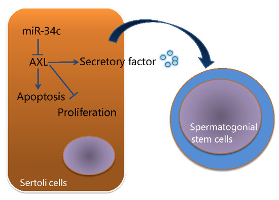 A schematic illustration of miR-34c targeting the AXL gene affects proliferation, apoptosis, and relative gene abundance of transcripts of reproduction-associated secreted factors in Sertoli cells.