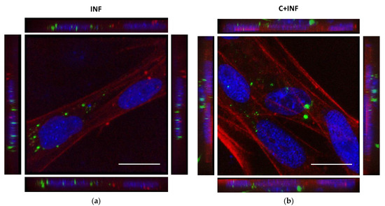 The immunostaining for P. salmonis in rainbow trout myotubes was performed to detect its subcellular location. The images and 3D reconstructions of both INF (Figure 1a) and C+INF (Figure 1b) indicated an intracellular location of bacteria (in green) in muscle cells (in red) near the nuclei (in blue). No P. salmonis was detected in the CTRL and CORT groups (Supplementary Figure S1). The isolated images for all conditions are available in Supplementary Figure S1.