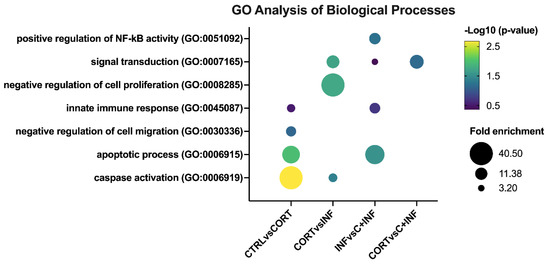 When comparing the CORT vs. INF groups, signal transduction, caspase activation, and negative regulation of cell proliferation were detected. In the comparison of the INF vs. C+INF group, the main biological processes were positive regulation of NF-kappaB transcription factor activity, signal transduction, apoptotic process, and innate immune response. However, no enrichment of biological processes for the CTRL vs. INF and CTRL vs. C+INF comparisons was observed. In the CORT vs. C+INF groups, only signal transduction was detected.