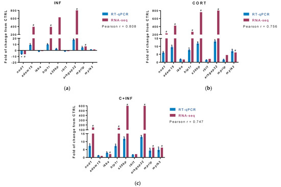 RT-qPCR validation of differentially expressed transcripts. The potential target genes selected for RT-qPCR validation of RNA-seq were nod1, adam15, ikba, hip1r, s30bl, rbl1, arhgap32, mprip, and mylk3. For RNA-seq, “#” indicates fold-change (absolute values > 2.0) and FDR corrected p-value (p < 0.05). (a) Validation between CTRL vs. INF. (b) Validation between CTRL vs. CORT. (c) Validation between CTRL vs. C+INF. For RT-qPCR, relative expression was normalized against fau and actb, and “*” indicates significant differences from the control (mean ± SEM, n = 3, p < 0.05). Pearson correlation (r) between RNA-seq and qPCR are also indicated (p < 0.05). Abbreviations: CTRL, control; CORT, cortisol; INF, infection; C+INF, cortisol+infection; nod1, Nucleotide-binding oligomerization domain-containing protein 1; adam15, Disintegrin and metalloproteinase domain-containing protein 15; ikba, NF-kappa B inhibitor alpha; hip1r, Huntingtin-interacting protein 1-related protein; s30bp, SAP30-binding protein; rbl1, Retinoblastoma-like protein 1; arhgap32, Rho GTPase activating protein 32; mprip, myosin phosphatase Rho interacting protein; mylk3, myosin light chain kinase 3; fau, 40S ribosomal protein S30; actb, β-actin.