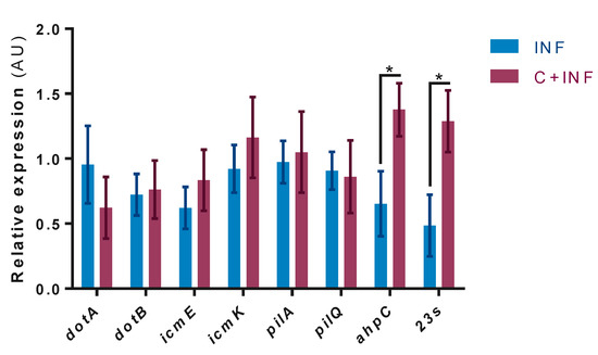 Bacterial gene expression between infected myotubes with cortisol pretreatment. Pathogenesis-related gene expression by RT-qPCR of P. salmonis: Dot/Icm (dotA, dotB, icmE, icmK), type 4 pili (pilA, pilQ), thiol-specific peroxidase (ahpC), and bacterial load (23s). Data were normalized against sdhA and gyrB and are expressed in arbitrary units (AU) as the mean ± SEM (n = 3). The “*” indicates significant differences between INF vs. C+INF (p < 0.05). Abbreviations: INF, infection; C+INF, cortisol+infection; dotA, deficient in organelle trafficking A; dotB, deficient in organelle trafficking B; icmE, intracellular multiplication E; icmK, intracellular multiplication K; ahpC, alkyl hydroperoxide reductase C; sdhA, succinate dehydrogenase A subunit; gyrB, DNA gyrase B subunit.