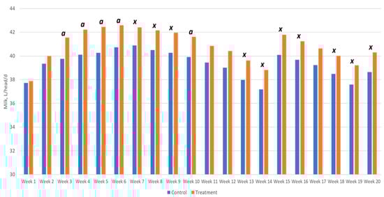 Average weekly milk production in the two groups (a = p-value ≤ 0.05; x = p-value ≤ 0.1).