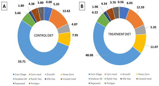 Contribution of different feeds’ raw materials to the average carbon footprint of (A) control diet, (B) treatment diet.