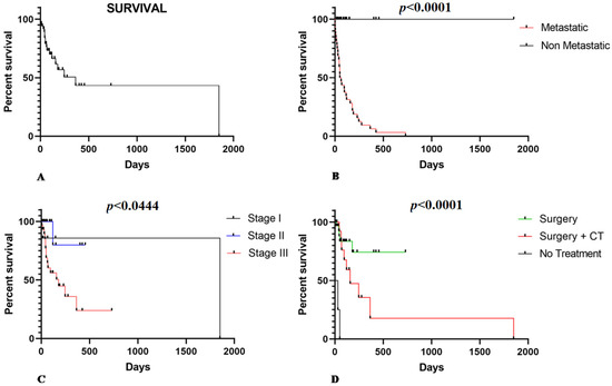The mean OS was 155.94 days (±148.37 days), independent of patient treatment (Figure 1A). Patients with metastasis at the time of diagnosis had a poor prognosis (p < 0.0001) (Figure 1B). Regarding the clinical stage, 60.3% (33/53) were at stage III, 26.4% (14/53) were at stage II, and 13.3% were at stage I (7/53). There was an inverse relationship between OS and tumor stage. Thus, patients at later stages had shorter survival times (p = 0.0444) (Figure 1C). Regarding treatment, 66% (35/53) of patients underwent surgery as the only treatment option (n = 35), and 27% (14/53) were treated with surgery associated with adjuvant chemotherapy (n = 14). In addition, in 7% (4/53) of cases, the owner declined any treatment. Patients who only underwent surgery experienced an average survival time of 128.83 (±118.84) days. In contrast, those who underwent surgery associated with chemotherapy experienced a longer survival time (262.43 ± 243.53 days). The patients without treatment experienced the shortest survival time (20.50 ± 19.5 days) (Figure 1D).