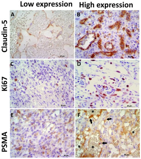 3.4. Claudin-5, PSMA, and Ki67 Immunoexpression