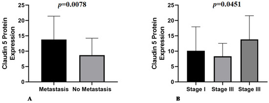 (A) Metastatic samples have higher Claudin-5 expression compared with non-metastatic samples (p = 0.0078). (B) Association of Claudin-5 expression with tumor stage, with stage III tumors showing higher expression than stage I and II tumors (p = 0.0451).