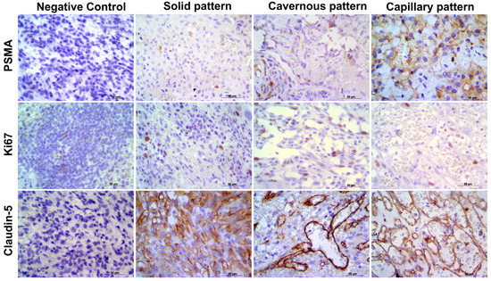 Representative image of each antibody in capillary, cavernous and solid patterns. It is possible to observe the negative control for each antibody and PSMA, Ki67, and Clauding-5 expression in the different histological subtypes. Harris hematoxylin counterstaining, DAB, 40.