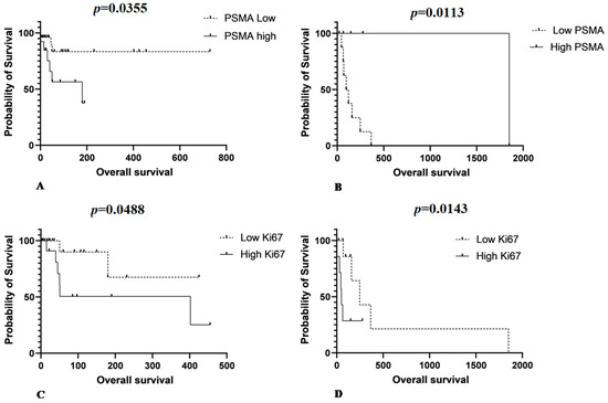 (A) Patients that underwent surgery as single therapy show low PSMA protein expression associated with increased survive time (p = 0.0355). (B) Patients treated with surgery associated with chemotherapy show the opposite relationship between PSMA and overall survival. Patients with low PSMA protein expression experience a shorter survival time (p = 0.0113). (C) A longer survival time is observed in patients treated with surgery with a lower Ki67 index (p = 0.0488) and (D) a longer survival time is observed for patients with low Ki67 index in those treated with chemotherapy (p = 0.0143).