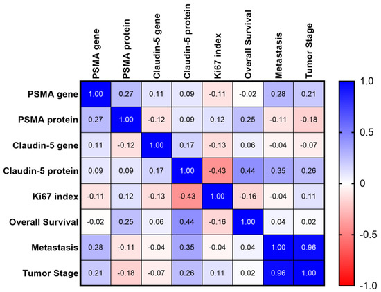 Multiple correlation analysis revealed a strong positive correlation between tumor stage and development of metastasis (r = 0.9597). Thus, patients at higher stages were correlated with metastasis at different sites at the time of diagnosis. A positive correlation was also observed between Claudin-5 protein expression and OS. In contrast, patients with higher Claudin-5 protein expression were also correlated with longer survival time (r = 0.4382). The Ki67 index was negatively correlated with Claudin-5 protein expression (r = 0.4264). The matrix of multiple correlations for all markers is shown in Figure 6.