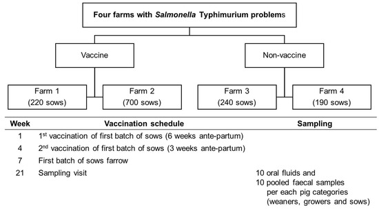 - Roesler, U.; Heller, P.; Waldmann, K.H.; Truyen, U.; Hensel, A. Immunization of Sows in an Integrated Pig-breeding Herd using a Homologous Inactivated Salmonella Vaccine Decreases the Prevalence of Salmonella typhimurium Infection in the Offspring. Zoonoses Public Health 2006, 53, 224–228. [Google Scholar] [CrossRef] [PubMed]