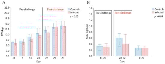 Evaluation of zootechnical performance. (A) Median values of individual body weight (kg) of experimental groups, measured at 0, 7, 13, 20, 27 and 29 days. Day 0 corresponds to the beginning of the in vivo trial, and day 20, indicated by the line, correspond to the day of infection. (B) Median values of average individual daily gain (ADG) in the experimental groups. ADG (13–20) indicates the average daily gain calculated in the pre-infection period: from day 13 to day 20; ADG (20–22) represents the average daily gain in the first period after infection (from day 20 to day 22; at day 20 was performed the experimental infection); ADG (0–29) is the average daily gain calculated in the entire experimental period (from day 0 to day 29). The comparisons were performed using the Wilcoxon Rank Sum test for independent groups. All data are reported as medians, minimum (min) and maximum (max) of results obtained for the pigs in the Control (n = 6) and in the Infected (n = 12) groups.