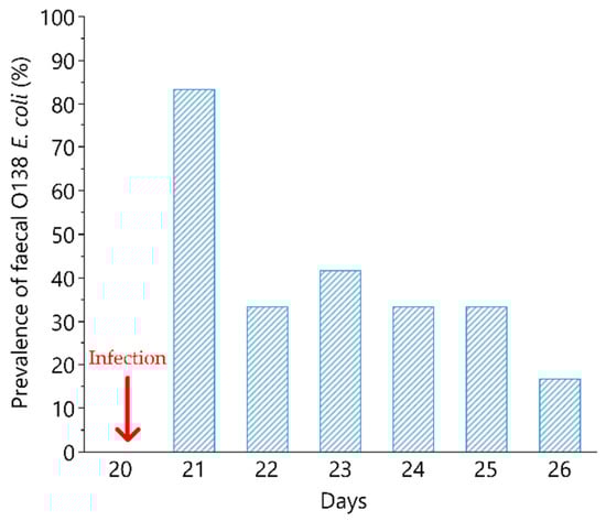 O138 F18 E. coli shedding after experimental pig infection. Percentage of piglets of the infected group (n = 12) presenting O138 F18 E. coli in faeces in the post infection period (day 21 to day 28). The experimental infection was represented by a single intragastric inoculum (5 mL) equivalent to 1 × 1010 O138 F18 E. coli colony-forming units (CFU)/5 mL and was performed at day 20. The arrow indicates the day of infection.