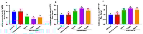 Additionally, it is crucial to investigate the transcriptomic pathway of clenbuterol concerning muscle growth. It was found that in ovo feeding of clenbuterol led to marked downregulation and myostatin gene expression (p < 0.01) in the control and normal saline groups. Similarly, Ijiri et al. [22] found that clenbuterol feeding resulted in decreased muscle myostatin expression. Myostatin is an essential regulator for skeletal muscle growth and contributes to clenbuterol-induced muscle growth and mass [74]. Lalani et al. [75] showed that IGF-1 had a positive regulatory impact on muscle growth. These reports supported our finding in which clenbuterol at 15 ppm had significant upregulation of IGF1r. These findings were consistent with [74,76]. They found that clenbuterol leads to IGF-1 upregulation. Moreover, Abo et al. [2] showed that an insulin-like growth factor is well established as a fundamental part of embryonic muscle development and proliferation. However, clenbuterol at concentrations of 10 and 20 ppm did not affect the IGF-1 receptor level. These data were in harmony with [22], who reported that clenbuterol feeding on a one-day-old chick did not change the IGF-1 expression. These data were also supported by IGFBP expression in which clenbuterol significantly upregulates IGFBP expression at 15 ppm concentration in other treated groups. These data were in line with [77], who reported that muscle growth stimulated by clenbuterol is coupled with a local increase in muscle IGFBP content.