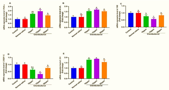 GHR is a growth hormone transmembrane receptor, an important hormone for normal growth [78]. Clenbuterol significantly upregulates hepatic GHr expression; this result was consistent with those of [79], who reported the importance of growth hormone in the postnatal growth of skeletal muscles, and IGF-1 and GHR both have good growth regulators, which leads to anabolic effects on proteins and carbohydrate metabolism, and mediates growth hormone activity [80]. In the same context, clenbuterol feeding led to significant upregulation of PPARα in other treated groups (p < 0.05), (p < 0.01), (p < 0.05) for clenbuterol at 10 ppm, 15 ppm, and 20 ppm, respectively. PPARα is highly expressed in the liver and plays a key role in lipid metabolism-boosting fatty acid oxidation [81]. This supports our finding that in ovo clenbuterol feeding possibly lessens fat deposition by the oxidation of long-chain fatty acids in the mitochondria and fatty acid oxidation in the liver [82]. Clenbuterol feeding showed significant upregulation in LPL mRNA expression with markedly decreased FAS mRNA expression, and this was consistent with [20], who reported that clenbuterol upregulated expression of the liver LPL gene. Clenbuterol modulates mRNA expression levels through attenuation of lipogenic activity (downregulated levels of the FAS in the liver) and fatty acid oxidation (increased levels of LPL in the liver gene expression), which facilitate lipid catabolism in agreement with our results. Kim et al. [82] reported that clenbuterol increased the rate of lipolysis and decreased the lipogenesis rate for adipose tissues.