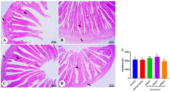 Photomicrograph of duodenum of control (A) and clenbuterol treated groups of chickens; (B) clenbuterol 10 ppm, (C) clenbuterol 15 ppm and (D) clenbuterol 20ppm showing intestinal villi composed of simple columnar epithelium (white arrow heads), connective tissue core (black arrow heads) of lamina propria and lamina muscularis (black arrows). Stain H&E, scale bar= 200 µm. (E) morphometric analysis of duodenal villi length. Columns with differ superscripts (a, b) differ significantly (p < 0.05).